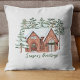 Celebrate the season with this cosy, hygge throw pillow featuring a watercolor scandi house framed by pine trees and a festive green wreath. The greeting is printed in traditional green Nordic festive wreath style, using elegant serif typography for a timeless look.