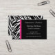 Modern and stylish zebra stripes business cards features black and white zebra stripes on the front and back and a pink accent border on the front. Stand out with these unique business cards. Perfect for variety of business types and professions. Available in a variety of colours and card stocks. Customise with your personal or business information. Click the "Customise it!" button to change the font style, text size, text colour and more!