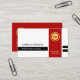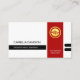 To your left is your prestigious name and the job title inside the black thin stripe. Sitting in the vertical red layer is a gold global city silhouette logo you can use with your business name at the base of the card.