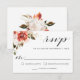 This modern watercolor floral wedding RSVP card has a lovely corner bouquet of subtle red and white flowers with deep green leaves. The colour scheme is a popular choice for weddings in any season of the year. It is particularly nice in fall or winter. The colour scheme works beautifully with earth tones, terracotta, red or off-white. Personalise the text template with your required response date.