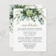 Design features a modern elegant floral bouquet of eucalyptus branches, magnolia leaves, twigs, and other botanical floral elements. The back features a matching wreath design to compliment the front. A universal design for all wedding themes and seasons.