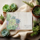 Unique fonts, colourful watercolor succulents and rustic wooden plank backgrounds are the highlights of these mix-and-match wedding products.This beautiful wedding guest book has foliage corner borders on a light, weathered wood background. A template is provided to enter your personal message, bride and groom's initials and wedding date that are centred in a small label on the back. Search ID515 to see all the matching products in this set.