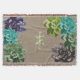 Light brown faux burlap print background with multi coloured succulents flowers and personalised monogram text with family name in the centre.