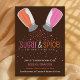 This adorable baby shower party invitation has the theme of Sugar and Spice! The design has two salt shakers, one orange to represent spice and one pink to represent sweet. They're shaking out cute little flakes and hearts over the words "Sugar and Spice". The background is a chocolate brown. These invites are fun and cute and sure to represent a baby shower! Your guests will love it.