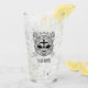 A hand drawn day of the dead sugar skull cat face on a drinking glass. There is a cross on it's forehead and a crown on it's head. Add your name to it.
