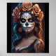 Discover the allure of sugar skull makeup with this captivating image. Close-up of a woman adorned with sugar skull makeup, featuring intricate designs and a palette of vibrant colours, symbolising a blend of cultural heritage and contemporary beauty trends.