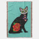 A black cat with day of the dead sugar skull make-up on in a backdrop of teal