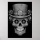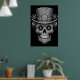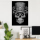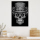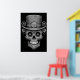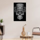 Sugar Skull images, black and white, in a cool top hat, on a wall poster.