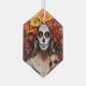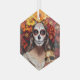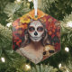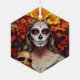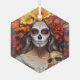 A celebration of life and death is a sugar skull lady—a striking embodiment of both beauty and mortality. Her face is intricately adorned with vibrant Día de los Muertos patterns. Her eyes are surrounded by petals reminiscent of marigolds. Cascading from her hair are colourful flowers and a skull with hollow eye sockets.