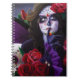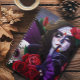 A fairy in a sugar skull day of the dead make-up wearing all purple surounded by red roses and skull