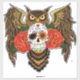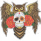 A brown great horned owl with a day of the dead sugar skull and red roses in a backdrop of orange