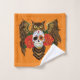 A brown great horned owl with a day of the dead sugar skull and red roses in a backdrop of orange