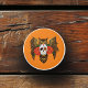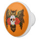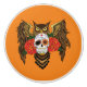 A brown great horned owl with a day of the dead sugar skull and red roses in a backdrop of orange
