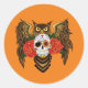 A brown great horned owl with day of the dead sugar skull and red roses in a backdrop of orange