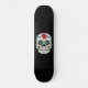 This image features a stylised skull, commonly known as a sugar skull or calavera de azúcar, a symbol associated with the Mexican holiday, Día de los Muertos. The skull is adorned with intricate floral patterns in vibrant colours such as blue, yellow, green, and red. A red rose is prominently placed on the forehead, and the eyes are replaced with geometric, diamond-shaped designs. The skull is set against a black background, which enhances the contrast and makes the colours pop.