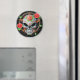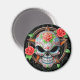 This intricate sugar skull design sits on top of a five point star that is framed by a large circle. The skull is decorated with swirls and dots as well as a large rose and leaves in the middle of the forehead. Delicate vines weave their way around the outer circle with two roses appearing on either side. The skull sits on a pure black background giving this magnet a beautiful contrast. This gorgeous Day of the Dead sugar skull makes an aggressive and stylish pattern.