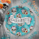 A colourful paper plate design for Day of the Dead festivities, featuring a variety of decorative sugar skulls with flower and swirl accents on a textured-effect turquoise blue background. If preferred, the provided 'Feliz Dia de los Muertos' banner and text layer can be deleted to use this design for other occasions. Search ID725 to see other colour choices and products with this fun pattern.