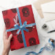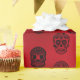 Cool wrapping paper has a Goth appeal. It's dark burgundy with black sugar skulls and Santa Claus hats.
