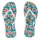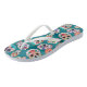 Bright images of sugar skulls make a colourful pattern on these fun flip flops. There are several different skull images, all individual in various colours, along with a boho style pattern snake. The images are placed on a black background.