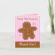 Customisable Christmas note or greeting cards with an adorable little gingerbread man with pink candy nose and buttons and white frosting. Pink and white striped background and gingerbread border. Perfect for thank you notes! Coordinated gift tags, postage stamps, stationery and magnets also available! PinkInkArt original!