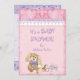 This adorable puppy smiles at your guests and invites them to share in your special day for your baby shower. The artwork is hand watercolored and contains a stuffed puppy with purple bow on her neck, a purple pacifier and pink rosebud booties. The background is a soft pink with hand painted white swirls, a hand painted scalloped cross stitch lace and rick rack border overlaying a contemporary swirl heart paper at the top. The reverse side has a purple and lavender background with dots and circles. On top of this border is a baby bottle, a binkie and the pair of rose bud shoes. There is a wide range of products designed to coordinate for a complete baby set. YOU MIGHT ALSO ENJOY:
