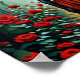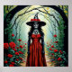 This fantasy poster features a haunted witch wearing sugar skull makeup and a red dress standing in an archway of twisted trees, surrounded by blooming red roses, symbolising mysticism and life-death duality. Finished in an oil paint art print.