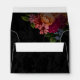 Lush floral arrangements in bright, warm colours ranging from coral and rose pink to golden yellow combine with vignetted, obsidian backgrounds to give the pieces in this elegant wedding suite a dark, moody ambience. This coordinating envelope features a corner border of flowers for the interior and an textured, obsidian background. Search ID829 to see the complete collection.