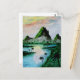 a traditional watercolor landscape painting of green mountains in front of a lake and green jungle under a colorful sunset on a postcard