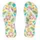 Yellow flip flops with a pattern of life preservers, palm fronds, watermelon slices and popsicles are perfect to dress up your outfit for any occasion.