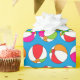 Beach balls in orange, pink, green, red and white on a blue background makes a fun gift wrap for summer birthdays and other occasions.
