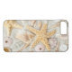 A phone case featuring a beach-themed design. The background is a light beige colour, resembling sand. Scattered across the surface are various seashells, starfish, and sea urchins. The seashells come in different shapes, sizes, and colours, ranging from white to beige to light pink. The starfish are a golden yellow colour and have a textured surface. The sea urchins are small and round, with a pink and white striped pattern. The overall effect is a summery, coastal vibe. The style is reminiscent of a flat lay photograph, with the objects arranged in a visually pleasing manner. The colour palette is soft and muted, creating a calming and relaxing feel.