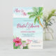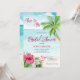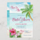 Summer beach tropical bridal shower invitation template, watercolor aqua blue beach, palm tree, hibiscus flowers, magenta and blue, casual modern brush script.