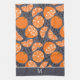This bright and colourful kitchen towel features a pattern of boho style orange slices on a complementary grey background. Your monogram is in white at the bottom on a matching border.