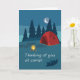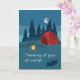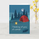 A night sky is filled with stars and a crescent moon. A cosy fire and red tent outside at night shows the promise of fun at summer camp. Let someone know you are thinking of them while away.