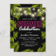 Summer birthday party invitations featuring a stylish black background that can be changed to any colour, twinkle string lights, tropical summer palm leaves, a pink & white neon sign, and a modern party template that can easily be personalised.