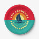 Summer family reunion lake party custom name Paper Plate. Add your own surname and date. Red sunset with blue water and sail boat silhouette. Disposable party supplies for garden party, BBQ, family meeting, gathering, dinner, trip, beach day etc.