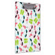 A clipboard featuring a summer themed pattern with illustrations of pink flamingos, flip flops, and retro cat eye sunglasses.