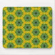 A Geometric pattern based on elements of real flowers which has a frosty snow flake like shape in the centre of a green hexagon circled with warm yellow petal like shapes. Kind of reminds me of a light frost on a late summer morning.
