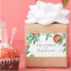 Summer orchard bountiful fruit, a rustic country farmhouse feel with overhanging branches laden with fruit. This is a fun summer watercolour design, with peaches, oranges, blush colours complimented by greenery and delicate flower blossom.