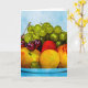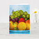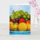 Closeup view - still-life - of a white porcelain plate filled with green and red grapes, strawberry, cherry, peaches and an apricot fruits. The gift of summer season. Health and happy life. Greeting card. Customisable, you can change or delete the template text inside the card.