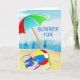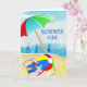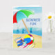 Summer themed greeting card with beach wear and items in the sand under a colourful umbrella. Customise the text on the cover and inside as you like. People celebrating and playing in the water in the distance. Perfect to celebrate the Summer Solstice. Art, image, and verse copyright © Shoaff Ballanger Studios, 2022.
