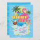 Summer Pool Party event invitation with flamingo pool float and beach ball.
