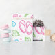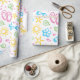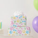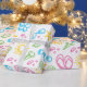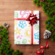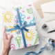 This roll of gift wrap features a fun print that says summer! Done in bright shades of green, yellow, pink and turquoise, the print features sun, ice cream cones, flip flops, sunglasses, sea shells, stars and beach stones on a white background.