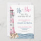 He or She? A cute beach or nautical themed gender reveal party to SEA what baby will be. A cute and trendy watercolor pink and white lighthouse on front in the middle of a blue ocean (complete with a seagull of course), and water pattern on back. A modern handwritten or script typography font in pink and blue, this enchanting print radiates charm and sophistication. Embrace the essence of summer with this coastal-inspired design. He or She Pink Blue Nautical Lighthouse Beach Summer Gender Reveal Party Invitation Theme