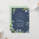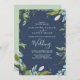 This summer greenery navy wedding invitation card is perfect for an elegant midsummer wedding. The botanical design features a lush arrangement of painted watercolor eucalyptus, greenery, and green leaves with subtle sprigs of blush pink blossoms on a navy blue background.