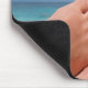 Mousepad with women's feet with pink red nail polish on a white beach on an island in the mediterranean sea relaxing during the summer holidays.
