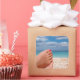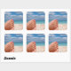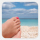 Square sticker of women's feet with pink red nail polish on a white beach on an island in the mediterranean sea relaxing during the summer holidays.