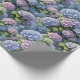 Clusters of vibrant hydrangea flowers in shades of blue and purple with green leaves on a soft, muted background