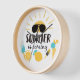 Bring the sunshine indoors with this playful and vibrant "Summer Is Coming" wall clock! Featuring a cheerful sun wearing cool black shades, delicious ice creams, citrus slices, and pops of blue and yellow, this design perfectly captures the joyful spirit of summer. Whether you're decorating your kitchen, kid's room, office, or beach house, this clock adds a burst of seasonal charm to any space.
