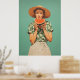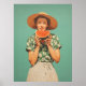 A cheerful woman in a sunhat and floral shirt enjoys a slice of watermelon against a vibrant teal background, capturing a perfect moment of summertime happiness.